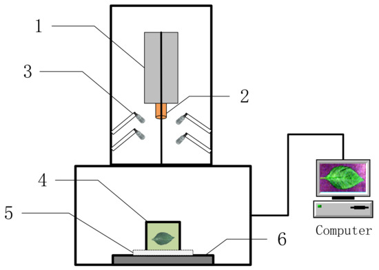 After completing the chlorophyll measurements, the leaves were cleaned with ultrapure water, and the excess surface water was removed using an absorbent paper. Figure 3 shows a schematic diagram of the hyperspectral imaging system used in this study (Wuxi Dualix Spectral Image Technology Co., Ltd. (formerly Sichuan Dualix Spectral Image Technology Co., Ltd.), Wuxi, China, Model: GaiaSorter). The imaging system mainly includes a tungsten halogen lamp as the light source, a hyperspectral camera, an electronically controlled mobile platform, a server and computer control, and other parts.