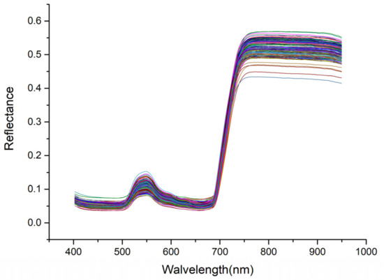 Chlorophyll content is one of the most important indicators of the health status of crops and is significant for guiding crop fertilization and field management in different crop growth periods [1]. SPAD values can be directly used as relative values to characterize chlorophyll content. A portable chlorophyll meter is usually used to measure the SPAD value of plant leaves to directly characterize the relative plant chlorophyll content. However, leaves need to be repeatedly inserted during the process, which makes large-scale chlorophyll detection using this method difficult. Research shows that the SPAD value can be used to accurately derive hyperspectral remote sensing data in a non-destructive and pollution-free manner at a low price. In recent years, hyperspectral remote sensing has become a powerful tool for chlorophyll content estimation. Because it is rapid, non-destructive, and capable of detecting chlorophyll over large areas, it is of great significance for crop growth monitoring, precise fertilization, and yield evaluation [2,3].