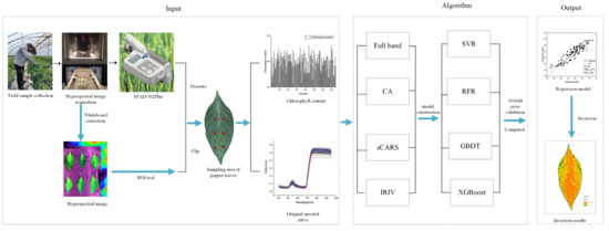In this study, 150 samples of pepper leaves with different leaf positions were selected as the research object, and the hyperspectral image data and chlorophyll content of the pepper leaves were obtained. The technical roadmap is illustrated in Figure 5. The hyperspectral images were first white-calibrated, and then the original spectral data were obtained through the region of interest. The CA, sCARS, and IRIV methods were used, respectively. The IRIV screens the characteristic bands and uses PLSR, XGBoost, RFR, and GBDT to construct regression models. A 10-fold cross-validation was used as the accuracy evaluation index to filter out uninformative variables. The optimal algorithm reuses the constructed model to establish the inversion map of pepper leaf chlorophyll distribution, which lays the foundation for exploring the dynamic response of pepper chlorophyll during the growth period.