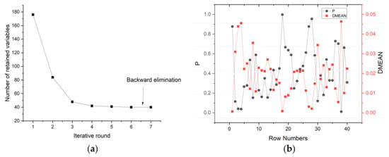 IRIV algorithm selection process: (a) The change in the number of retained informative variables in each round; (b) Changes in P value and DMEAN in the sixth round.
