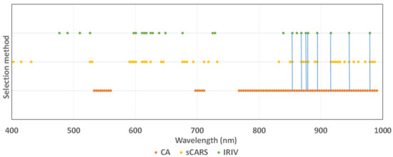 As shown in Figure 9, the order of the three methods used to simplify the model capacity is as follows: IRIV > sCARS > CA. The CA, sCARS, and IRIV algorithms selected 76, 46, and 26 characteristic variables for modeling, accounting for only 43.18%, 26.14%, and 14.77% of the entire band, respectively. The sensitive wavelengths of pepper leaf SPAD value were concentrated between 415.4–431.5 nm, 526.7–676.2 nm, and 839.3–979.2 nm, indicating that these three bands are closely related to pepper leaf SPAD value, as shown in Figure 9, where the blue line part is the same part of the band selected by the three feature selection methods, and they are 853.8 nm, 868.4 nm, 875.7 nm, 879.3 nm, 916 nm, 945.6 nm, and 979.2 nm. This may be related to the plant nutritional status. When the nutritional status is good, the content of chlorophyll in leaves is high, there are more cell layers, and the gap between mesophyll and cells is thick, which can further increase the spectral reflectance. Finally, the higher the SPAD value, the higher the reflectance, and the same correlation is also high, which provides a reliable mathematical basis for the chlorophyll diagnosis model of pepper leaves [34].