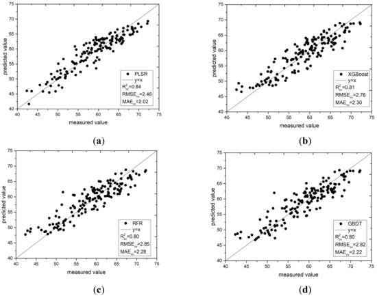 Scatter plot of measured and predicted values of the four models: (a) PLSR; (b) XGBoost; (c) RFR; and (d) GBDT.