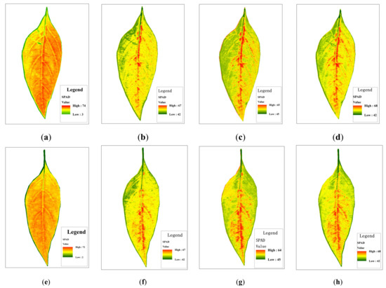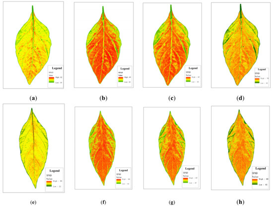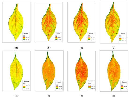 As shown in Figure 11, Figure 12 and Figure 13, different colors (green, yellow, and red) and color depth represent the SPAD value of pepper leaves at different concentrations. Overall, leaf chlorophyll spreads around the central vein. In the lower leaf, the overall color was evenly distributed, and the yellow and red were darker, while the middle leaf and upper leaf chlorophyll were lighter in yellow and red. The distribution of SPAD value in different leaf positions can be seen intuitively: lower > middle > upper, which is consistent with the actual measurements regarding the distribution and changes in the trend of pepper leaf SPAD values, as well as with the growth law of the pepper seedling stage.