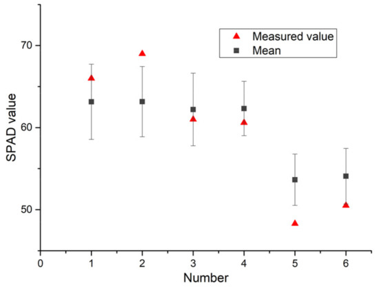 The SPAD inversion images of pepper leaves obtained by the IRIV-XGBoost algorithm were separately counted. From the mean and standard deviation of each pixel of the inversion image (Figure 14), most of the predicted values are consistent with the measured values, and the predicted and measured values have strong correlation. This shows that the use of hyperspectral imaging technology to construct the SPAD distribution map of pepper leaves is effective, realizes the rapid and accurate acquisition of the SPAD of pepper leaves at a small area scale, and provides a theoretical basis for later crop growth and the development of new equipment.