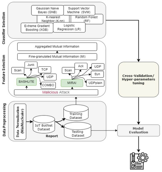 Feature selection methods were used in different research disciplines to enhance the proposed machine learning models, for instance IDS for vehicular ad hoc networks [23], drone intrusion detection [24], clickbait detection on social media [25], detection of diseases in health informatics [26] and virtual screening for molecular similarity searching [27]. In addition to machine learning methods for IDS in IoT, several deep learning methods were applied for intrusion detection systems in IoT, which are discussed in [28]. Although there are several studies in the literature addressing the IoT intrusion detection, more research efforts are needed to consider the special characteristics and challenges of IoT systems, which including the limited battery power and processor capacity. According to [5], it is needed to consider the trade-off between accuracy of detection and performance overheads to provide efficient computational and communication overhead, and high detection accuracy. Therefore, this paper proposes a feature selection-based method with several machine learning methods to enhance the performance of IoT Botnet classifiers. The feature selection methods include Mutual Information (MI), Principal Component Analysis (PCA) and ANOVA f-test at fine-granulated detection level.
