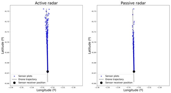Plots generated by the active and passive radar sensors corresponding to the actual incoming drone.