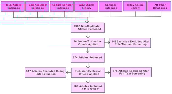 Initially, from 2360 articles, duplicates found were removed and, after reviewing the abstracts of these papers, 874 of them were selected for a full-text review. This study included both journal and conference articles. After reviewing the full-text of these papers, 693 papers were excluded, as they used duplicate methods or were published earlier. Finally, 181 papers were studied in this research. Figure 2 illustrates the selection procedure of the articles for this study using a PRISMA diagram.
