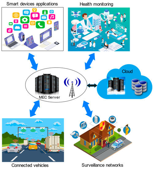 With Multi-Access Edge Computing, a cloud server is deployed at the cellular network’s base stations. It executes tasks such as enhancing the application’s performance and minimizing network congestion, bandwidth use, and latency for subscribers that cannot be achieved with a conventional network architecture [75,76,77]. Even though the processing and memory capabilities of mobile devices improve, they are still not sufficient to handle compute-intensive tasks, which has led to MCC and MEC models [78]. The MEC architecture is portrayed in Figure 5. MEC considerably reduces the process duration and energy demands of mobile devices by setting up computational and other resources close to the base stations [79]. As base stations serve as crucial access points to several IoT devices, end devices could be directly serviced with just one hop through MEC [80]. MEC showcases a low latency, proximity to the user, location awareness, and geographical distribution. However, it restraints the need to install a dedicated MEC server for MEC services. With the rise in the demand for resources over time, scaling is another major challenge [81]. MEC exhibits the reliability, energy efficiency, and a low latency suitable to diverse applications [82] and outperforms MCC comparably [83].