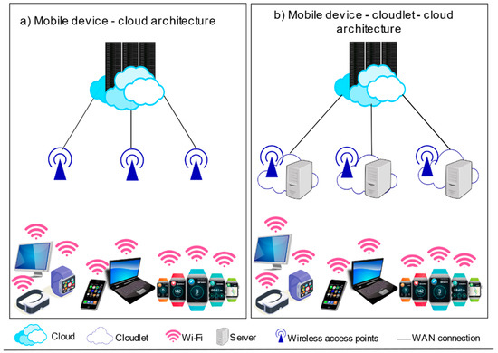 The cloudlet is featured as the middle layer in the three-tier architecture comprising of mobile devices, the cloudlet, and the cloud [84,85] shown in Figure 6. It further possesses connectivity, security, virtualization features, and closeness to mobile users enabling a low latency. Cloudlets are similar to mobile clouds and nearer to mobile devices befitting real-time scenarios. They focus on servicing time-sensitive applications operating under restricted bandwidth conditions and interactive mobile applications with a large resource demand and offer resources at a minimum latency [83]. Cloudlets back mobile clients’ local services by splitting tasks within cloudlet nodes that are nearer to mobile devices. While the cloudlet suits the mobile–cloudlet–cloud structure [90], fog computing is an alternative, supporting huge data traffic with resources located at anyplace within the thing-to-cloud continuum [2]. Cloudlets are alluded to as micro data centers (MDC) at times [91], mirroring conventional data centers of cloud computing. The MDC may be a cloudlet or edge node implemented in between IoT devices and the cloud [2].