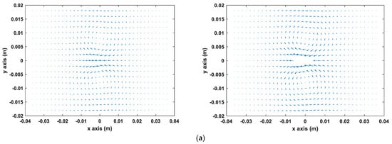 The behavior of the eddy current around the crack on the sample plate was simulated using the accelerated FEM solver. The sensor probe was situated above the center of the sample plate with different rotation angles and the lift-off of 0.5 mm. Figure 2 shows the vector diagram of the eddy current flow under three rotation angles, 0°, 45°, and 90°, respectively.