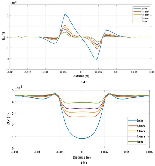 Figure 4 illustrates the x and z components of the magnetic field caused by the cracks with different depths varying from 1 to 2 mm under the excitation frequency of 20 kHz. It can be seen that, in the center of the crack, the z component of the magnetic field was zero while the x component of the magnetic field reached the minimum value. It can be observed that, the deeper the crack, the larger the peak value of and .