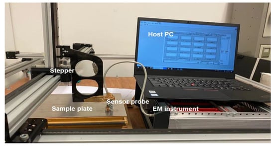 Figure 7 shows the experimental setup for crack detection, consisting of a stepper, the electromagnetic (EM) instrument, host PC, sensor probe, and the sample plate. The sensor probe was attached to the stepper, whose movements in different axis can be controlled by the host PC to perform the scanning process. The sample plate was fixed at the stage and the sensor probe was right on the top of the cracks during scanning. The experiment parameters are listed in Table 1. The magnetic field was detected by the EM instrument developed by the Sensing, Imaging and Signal Processing group at the University of Manchester [,].