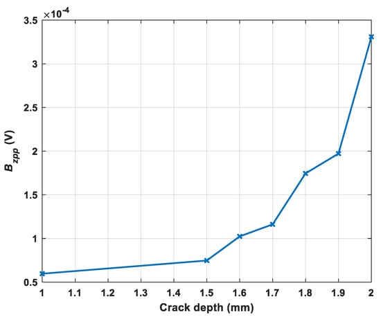 The measured results were presented by the difference of the received voltage of the sample with the crack and without the crack. As shown in Figure 10, the excitation frequency from 10 to 60 kHz is used for testing the crack with a depth of 2 mm. It can be noted that frequency ranges from 20 to 50 kHz works well and have a better SNR. Therefore, 20 kHz was selected as the excitation frequency. Besides, the excitation frequency of 20 kHz works for different depths of crack is shown in Figure 11 and it can be noticed that there was a rising trend of the peak-to-peak value of the z component of the magnetic field as the crack depth increases.