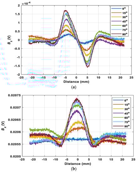 As can be seen in Figure 12, the trend of the magnetic field under different rotation angles is similar compared with the simulation results. Figure 13 shows the received maximum value of the z component and the change of x component of the magnetic field with a range of rotation angles. The value of the x and z components of the magnetic field increased with the rotation angle from 15°, reaching maximum when the rotation angle is 90°. This is because more eddy current was blocked (the flowing route is influenced) due to the presence of the crack as the sensor probe rotates vertically to the crack. Then continuing to rotate the sensor probe, the value reversely decreased to reach its minimum. They agreed with the simulated results which were symmetric with respect to 90°. Moreover, it can be seen in Figure 13b that there was a coil angle immune feature for the ratio of the maximum of and the change of when the sensor probe scans the crack on the surface of the metal. Due to the measurement error and the environments, there was a small fluctuation for the ratio, but most of them were mainly around 0.8, which was consistent with the simulated results. Besides, it also showed that the position of the receiving coil for detecting x component of the magnetic field did not influence the coil-crack angle insensitive feature. Therefore, the effect caused by the coil-crack angle can be eliminated by the feature and may be useful to estimate the depth of the crack without the disturbance of the crack orientation.