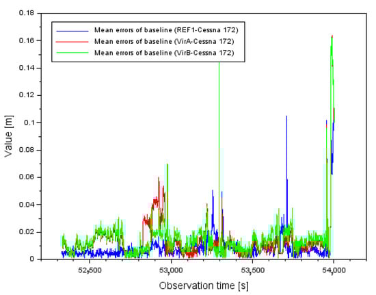 In a multi-vector RTK-OTF positioning model, the aircraft coordinates are determined for a single baseline according to Equation (1), and then the resultant value of the aircraft position is calculated separately for each XYZ component. The mathematical model is based on the arithmetic mean method according to Equation (3). The aircraft coordinate values along the XYZ axis are summed and then the resultant value is calculated. The mathematical model in Equation (3) is devoid of measurement weights, so the precision of aircraft coordinates determined from a single baseline is assumed to be equal.