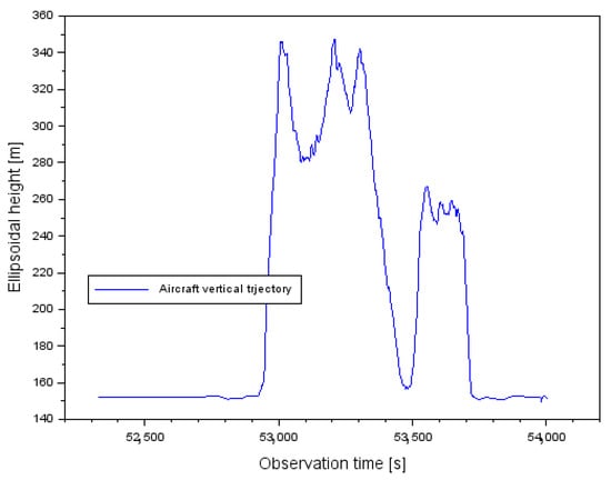 In aviation experiments in Poland, the RTK-OTF differential technique was mainly used to determine the reference position of the flight. Thus, the works [11,29,30,31] showed the results of DGNSS positioning accuracy in relation to the RTK-OTF solution. In turn, works [29,32,33,34,35] presented position error results for the SPP (Single Point Positioning) positioning method in air navigation. Subsequently, papers [32,34,36,37] present results of EGNOS (European Geostationary Navigation Overlay Service) solution in relation to the reference position of the flight determined from the differential RTK-OTF technique. Furthermore, in papers [38,39] the results of PPP positioning were compared with the RTK-OTF solution. Then, in the work [40], the model of the resultant flight speed of the aircraft was calculated and the results were compared with the RTK-OTF precision solution. In publication [41], the results of determining the XYZ geocentric coordinates of the aircraft from three independent RTK solutions in OTF mode were presented. The coordinate difference between the different RTK-OTF solutions is less than 0.19 m. Another work [42] shows the results of determining the ellipsoid of the point position error for BLh geodetic coordinates determined from the differential RTK-OTF technique. The results of the point position error ellipsoid parameter of 0.03 m were obtained in the calculations.