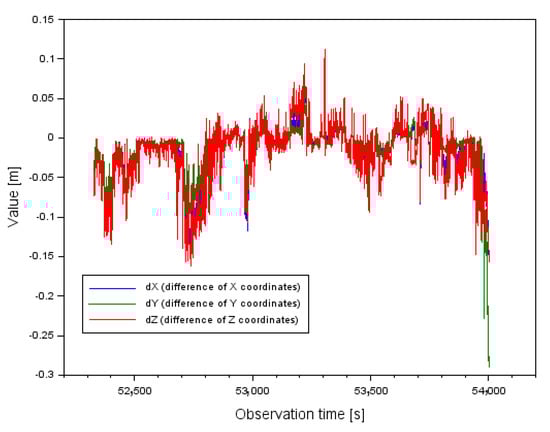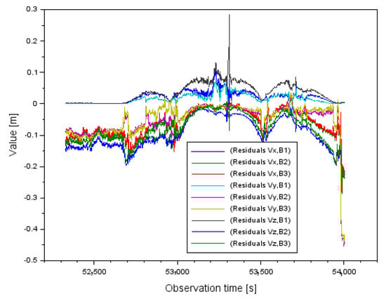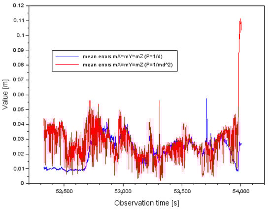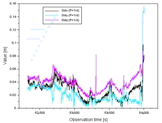 Comparing the parameter results for both measurement weights, it is clear that the standard deviations are smaller for the measurement weight . Therefore, the parameter values for the measurement weight presented in Figure 12 have been improved by about 75–77% with respect to the results for the measurement weight shown in Figure 11. It is worth mentioning that for some single measurement epochs the parameter values can be seen as outliers in Figure 11 and Figure 12, which is obviously due to the correction results shown in Figure 8 and Figure 9. The larger the correction value, the standard deviation also increases, which is well shown in Figure 11 and Figure 12.