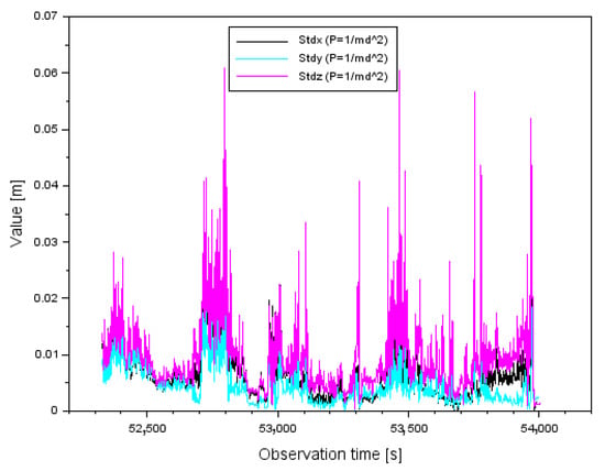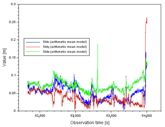 Figure 12 shows the results of the standard deviations for the measuring weight . The values of the parameter range from 0.001 m to 0.054 m. Furthermore, the arithmetic mean for the parameter is equal to 0.007 m. The values of the parameter range from 0.001 m to 0.036 m. In addition, the arithmetic mean for the parameter is equal to 0.005 m. The values of the parameter range from 0.001 m to 0.061 m. In addition, the arithmetic mean for the parameter is equal to 0.009 m.