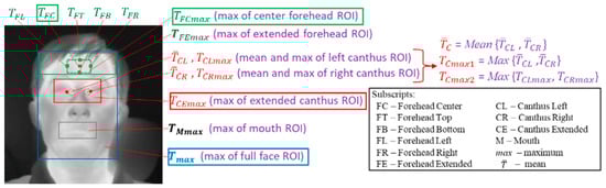 We identified facial key-points in IRT images by matching landmarks on visible light images to thermal images with an image registration approach [46] as well as manual labeling. Based on the identified facial key-points, different regions/points on thermal images were defined and the temperatures at these regions were obtained from thermal images (Figure 2). Since IRTs exhibit varying degrees of instability and drift [32], all IRT-measured temperatures were compensated with a blackbody (ETRS) in the system. Details about the definitions of these temperatures and temperature compensation with an ETRS can be found in Section 2.2 and Section 2.3.1, respectively, in our previous publication [41].