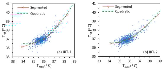As mentioned in Section 2.5, the training data (for 612 and 606 subjects with IRT-1 and IRT-2 respectively) were used to determine the relationship between different (, , or ) and with different regression methods (constant offset, ordinary linear, quadratic, and Deming). We also implemented weighted linear, binning, and segmented linear regression methods due to the nonuniform distribution of temperatures. While the quadratic method usually showed nearly identical regression curves (Figure 3) with the segmented linear regression method, it led to nonmonotonic regression curves for some cases. Therefore, only the segmented linear regression method is discussed in this paper.