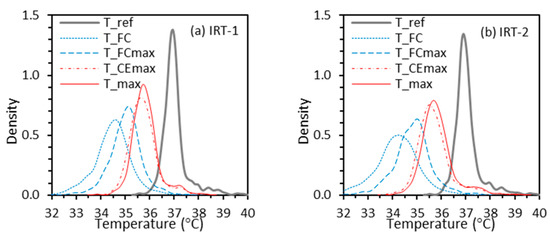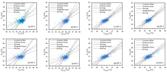 The results in Figure 4 indicate that lines for constant offset, ordinary linear, and Deming regression methods exhibit a common point of concurrency in each graph, near ≈ 37 °C, ≈ 34.5 °C, ≈ 35 °C, ≈ 35.5 °C, and ≈ 35.7 °C for both IRT-1 and IRT-2. That these lines intersect near a single point is likely because the least squares approach minimizes the sum of squared residuals, which means each data point contributes equally to the sum. Therefore, a temperature interval with more data will have larger impact on the fitting equation. The location of each point of concurrency is related to the mean temperature offset between the reference value and facial measurements, which was discussed previously [41]. Figure 5 shows the kernel density curves of , , , and for IRT-1 and IRT-2. The curves for both IRTs are very similar, with the peak density for each site matching the corresponding points of concurrency. The Pearson correlation coefficients between and /// for IRT-1 are 0.53, 0.60, 0.79 and 0.82 respectively. These numbers for IRT-2 are 0.52, 0.57, 0.80, and 0.82.