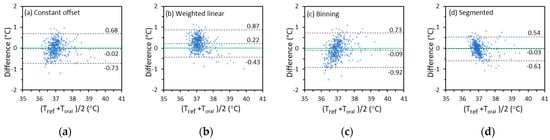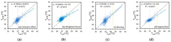 Results in Figure 6 indicate that the segmented method produced the best fit (largest R2 value), whereas the binning method produced the trend line that was closest to the ideal = line. Given the highly non-uniform distribution of data, small differences in the slopes of the trend lines do not reflect overall accuracy differences. Two vertical lines at = 37 °C and 38.5 °C separate the data into three temperature intervals for comparison with Table 5. Data above the ideal trend line cause a positive and vice versa. A wide data distribution in the vertical direction correlated with a large . For example, the points in Figure 6c are the most dispersed in the vertical direction although the trend line is close to the ideal line, and the points in Figure 6d are the least dispersed. This indicates that for the binning method is the largest and for the segmented linear method is the smallest among the four regression methods, as have been shown in Table 5. Therefore, the trend line slope and intercept, the data point variability, and the coefficient of determination should be considered all together when reading a scatter plot. A direct qualitative view of the clinical accuracy through a scatter plot should be supported by quantitative values of other metrics, such as , , , , and Se/Sp/.