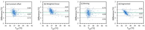 Our analysis of regression approaches indicated no clear optimal method that can improve all clinical accuracy metrics. A specific regression method tended to provide the best clinical accuracy in terms of a specific metric. When the full range of temperatures were considered in our data, the segmented linear regression provided the smallest values, the least scatter (and the highest R2 value) in Figure 6, and the narrowest difference distribution range in Figure 7. However, when we restricted the temperature range to the diagnostic zone (37 °C ≤ ≤ 38.5 °C), the constant offset, weighted linear, and binning methods provided the highest Se/Sp and the smallest bias.