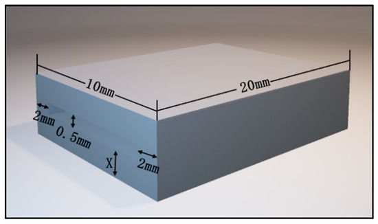 The fabrication details of the device for bite force detection on the local position are as follows: resin samples were designed using computer-aided design (CAD) software (TRIOS 3, 3 Shape, Danish) prior to three-dimensional (3D) printing. The upper and lower layers had the same size of 20 mm in length and 10 mm in width, meanwhile five different thicknesses were set in 0.5 mm, 1.0 mm, 1.5 mm, 2.0 mm, and 2.5 mm, respectively. The experiment result of dimension parameters of the resin samples are listed in Table 1, meanwhile the experiment result of the 3D image by CAD software is shown in Figure 1. The 3D image data were saved in Standard Tessellation Language (STL) file format and then fabricated with resin composite materials (Model V2.0, UnionTech, Shanghai, China) using additive manufacturing techniques and a 3D printer (S300, UnionTech, Shanghai, China). These dental materials are commonly used in dental practice. The experiment result of the virtual 3D models and printed objects are presented in Figure 2.