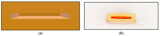The main body of the device, created by 3D printing technique, is a hollow cuboid structure with an opening on one side. The prepared film is gently inserted into the main structure of the resin sample. After that step, only the electrical circuit is exposed, and the rest was wrapped inside the resin body. The piezoresistive-film insertion process should be conducted gently and without any resistance interference. The experiment result of piezoresistive-film insertion is shown in Figure 3. If resistance is encountered, which means that the resin material is not fully shaped during the printing process and the 0.5 mm hollow gap is not completely formed, the resin sample should be replaced by a new one in order to avoid damaging the sensor film.