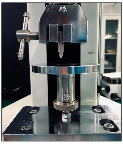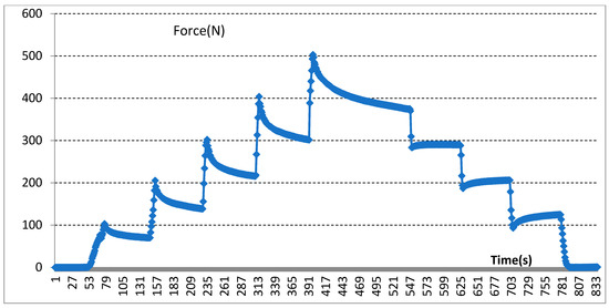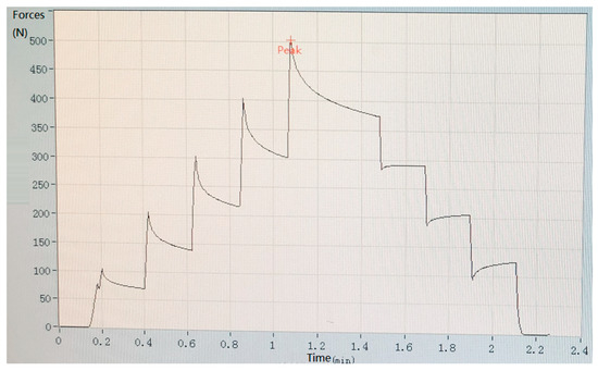In the experiment, biosensors were divided into five groups based on the different thicknesses of the device’s size: group one (thickness: 0.5 mm); group two (thickness: 1.0 mm); group three (thickness: 1.5 mm); group four (thickness: 2.0 mm); group five (thickness: 2.5 mm). Mechanical pressure-loading tests were conducted according to the computer-aided programs (CI701G) and equipment (tensile strength machine PT-1198, BaoDa, Guangdong, China) for each group sample, respectively; see in Figure 4. The standard mode of force testing is step loading and unloading. Dynamic loading force was set to add 100 N every 12 s by using a custom chisel head (size 2.0 mm), the custom chisel head is presented in Figure 4. The mechanical force involves loading and unloading with a similar procedure, in which the peak value is 500 N. In addition, the stress values loaded by the computer program were also stored in the computer system simultaneously. The experiment results of the pressure-loading tests are illustrated in Figure 5 and Figure 6.