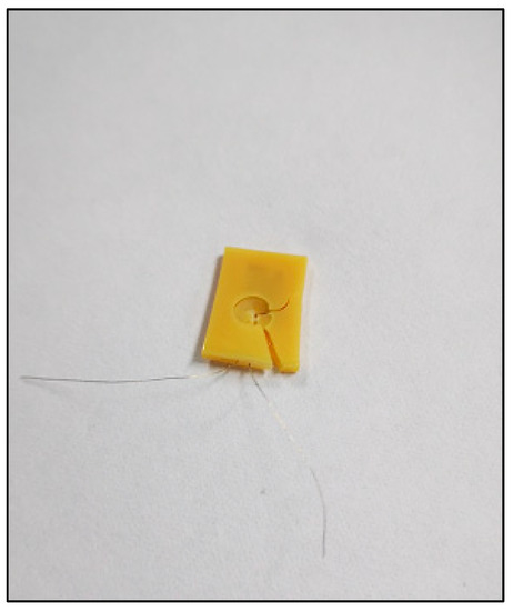 Marginal sealing is another crucial step after film insertion for resin specimens’ and piezoresistive-film sensors’ conjunction. This encapsulation can be implemented in two ways: the first involves using laser welding to weld a 3D-printed resin into a closed state. The ultraviolet light is emitted by a light-curing lamp and irradiates layer by layer of the liquid resin. This operation cures (polymerizes) the liquid resin and results in an excellent edge sealing. The second method is flowable resin sealing by light-curing technique. Flowable resin composites (Z350XT, 3M ESPE, St. Paul, MN, USA) were selected to bond the two ends of the piezoresistive-film sensor (HuaLanHai, BHF350-3AA, Guangzhou, China) with the lower layer and attached the two cured resin layers together in this trial. Then, light-curing was conducted by using an LED lamp (3M, EliparTM LED Curing Light, Light-curing unit power: 1200 mW/cm2, St. Paul, MN, USA) for 40 s. The newly developed flowable resin composite was characterized by low viscosity, high flowability, and resistance to crack propagation [24], hence providing better marginal sealing, which cannot be interfered with the complex environment of the oral cavity when the bite force is applied. Successful conjunction of resin-based dental materials and piezoresistive-film sensor achieves the foundation of occlusal force detection. At this stage, it should be noted that the two wires of the piezoresistive-film sensors should not contact each other, so as not to cause the occurrence of short circuit phenomenon during the later measurement.