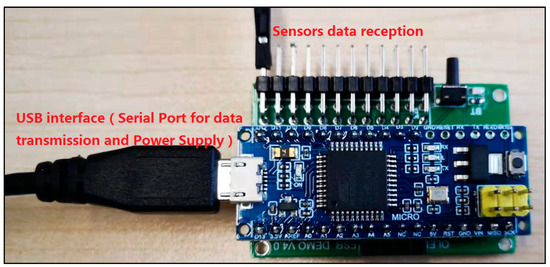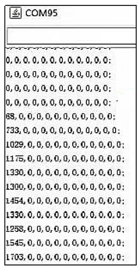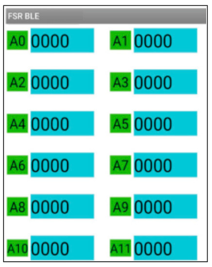 In order to capture the pressure signal of the front-end bio-sensor, a customized pressure signal acquisition controller was leveraged to capture voltage signal. The customized signal acquisition controller can also change the voltage signal to mechanical the stress signal. Moreover, the controller can visualize the stress signal in personal computer or mobile phone by protocols of serial port or Bluetooth 4.0. A picture of the whole controller setup is shown in Figure 7. The controller can support up to 12 channels’ input signal data from film pressure sensors. A low-powered, micro-programmed control unit (MCU) (STC micro, STC89C52, Shenzhen, China) was integrated in the pressure signal acquisition controller. The MCU was programmed and can control the acquisition of 12 channels’ input signal data, converting the analog signals into digital signals through a multi-channel AD (AVIA Semiconductor, HX711 AD, Xiamen, China) conversion module. The converted analog signals were sent to a personal computer or mobile phone for data visualization in real time. The signal represents the range of measuring forces (0~3000 N). If the converted data was sent to personal computer, the protocol of serial port was utilized for data transformation, as shown in Figure 8. This can list the pressure data from the sensors for every 3 s and shows it through a line chart. If the converted data was sent to a mobile phone, the protocol of Bluetooth 4.0 was utilized to accomplish data delivery, as shown in Figure 9. The delivered data can be used for any smart phone APP for data visualization. The power supply of the controller is accomplished by a USB interface (5 V, 1 A). Any standard USB charger can be used for a power supply for the controller.