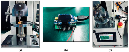 Electrical measurements of the sensors: (a) Connection of piezoresistive chip circuit to an external unit; (b) Pressure signal acquisition device; (c) Voltage changes under mechanical stress loading.