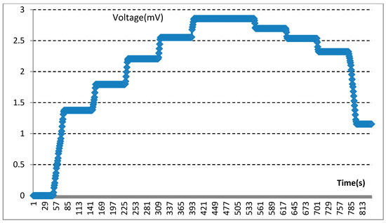 Moreover, our various sandwich-integrated sensors were tested in the tensile strength machine, as shown in Figure 10a. The change of voltage from the sensors was acquired by the pressure signal acquisition device, as shown in Figure 10b. Output voltage changes were due to the pressure changes of the tensile strength machine. The voltage signals are transmitted to a personal computer, as shown in Figure 10c. Figure 11 shows the voltage changes with different times. The experiment demonstrates that the trend of voltage changes is the same as the pressure force changes, as shown in Figure 12, which also proves the effectiveness of our sensors and circuits for occlusal force collection.