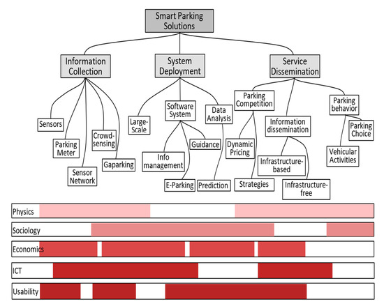 Categories of smart parking solutions and the spectrum of disciplines related to the topic, Source: A Survey of Smart Parking Solutions [4].