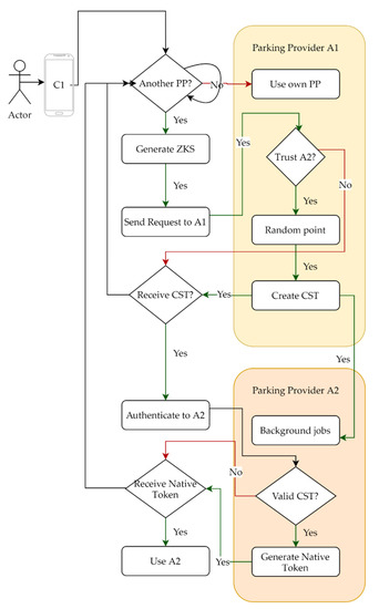 An extraordinarily strong point for this approach is that the user cannot be tracked between parking providers. User C1 can interact, using a different virtual identity, with P1, P2, P3, and P4. Only P1 (to which the user consented to personal data usage), the provider that guarantees it access to the network, is aware of the client’s interaction.