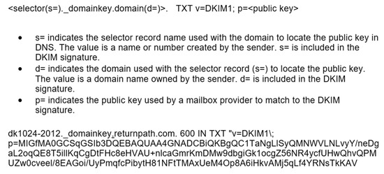 - Validity Help Center. DKIM DNS Record Overview. Available online: https://help.returnpath.com/hc/en-us/articles/222481088-DKIM-DNS-record-overview (accessed on 24 June 2021).