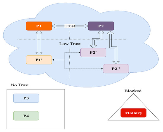 Depending on the agreement, P1 and P2 could choose to trust each other’s partners. As described in Figure 11, P1 could consider low trust P2′ and P2′. In the same manner, P2 will consider low trust P1′. We consider this to be a trust depth of one. Let us assume P1′ is the junior partner (does not manage users) of P1 and will accept a trust depth of two.