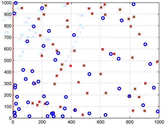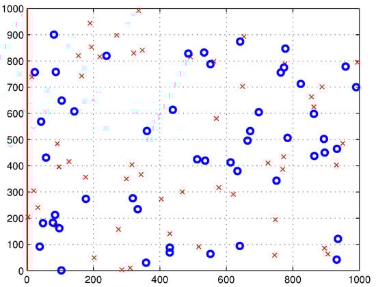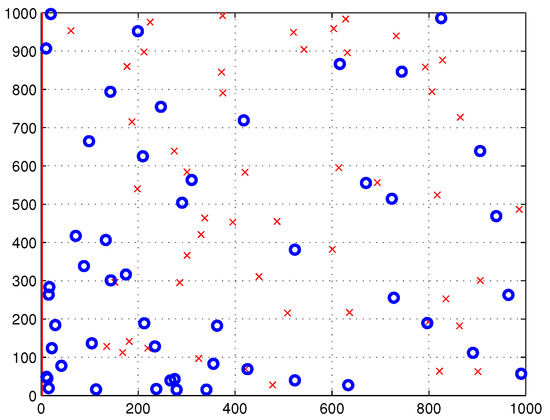 This work aims for an power-efficient deployment strategy of multi-UAVs that simultaneously serves all outdoor and indoor users within the disaster-affected area, . More specifically, in this work, three different clustering algorithms are invoked for use in partitioning the users which corresponds to partitioning the coverage area, , into n subareas. One UAV is assigned to serve each subarea, . Moreover, this work considers two scenarios of user distribution inside the coverage area, namely uniform distribution and non-uniform distribution using beta random distribution, denoted as function . In this work, the MATLAB beta random generation function betarnd (A, B, m, n) is used to generate an m-by-n array. This array contains random numbers from the beta distribution with parameters A and B, with , , and n = number of users inside coverage area. Figure 1 illustrates the distribution of outdoor and indoor users within the disaster-affected area, , which is represented as blue circles and red crosses, respectively.