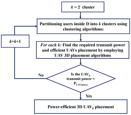 - The required total transmit power to provide wireless coverage to all users inside is determined using Equation (4b). If the UAV transmit power ≥ , then the value of k is increased by 1. In other words, the number of clusters of users inside is increased by 1.