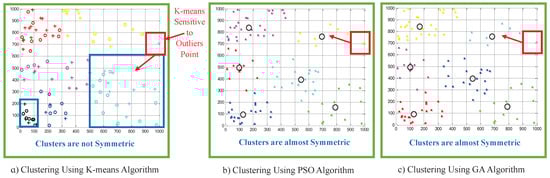 A K-means algorithm is relatively a simple algorithm and is easy to implement, which makes it the most popular algorithm that is used in several fields. However, a K-means algorithm is very sensitive to the initial cluster centers. More specifically, in K-means algorithms, the initial cluster centers are chosen randomly; this may cause three possible problems: (i) The final clustering results are not unique. For different runs of the same input data, the algorithm produces different clusters [31]. (ii) The initial cluster center has an influence on the number of iterations. The number of iterations required for the algorithm to converge is high if the chosen initial cluster center is located far away from the final cluster center [31]. (iii) The algorithm may converge in local minimum instead of global minimum, which results in a sub-optimal solution [32,33]. Furthermore, the K-means algorithm is sensitive to outliers and noisy data. The outliers have an influence on the clustering of data points that results in some data points being clustered incorrectly [32,33]. Moreover, the algorithm produces clusters that are not symmetric, where the clusters have unequal sizes and densities (unequal numbers of data points in each cluster) [34].