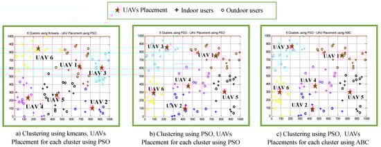 Figure 7 shows three of the clustering results and the UAVs placements from Table 3. Figure 7a depicts the simulation results of the proposed algorithm that iteratively invoked the K-means clustering algorithm and the PSO-based efficient UAV 3D placement algorithms. Meanwhile, the simulation results of the proposed algorithm that iteratively invoked the PSO-based clustering algorithm and two of the variants of efficient UAV 3D placement algorithms, namely PSO-based and ABC-based efficient UAV 3D placement algorithms, are depicted in Figure 7b,c, respectively. In this case, the outdoor and indoor users are distributed uniformly, which are denoted by the circle and cross symbols, respectively. These figures illustrate that the users are partitioned into six clusters, and one UAV is assigned to each cluster, where its 2D position is denoted by star. The coordinate of the 3D placement of each UAV in Figure 7a–c is presented in Table 3. It can be observed from Table 3 that the total UAV required transmit power is at a minimum when the UAV altitude is close to the minimum UAV altitude of 60 m. This is because there is a trade-off between the UAV altitude, the probability of LoS and the coverage performance in terms of coverage radius [8]. For lower UAV altitudes, the probability of LoS between transmitter and receiver decreases due to the shadowing impact. Thus, it results in a decrease in the total UAV required transmit power of each UAV.