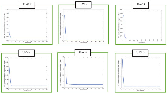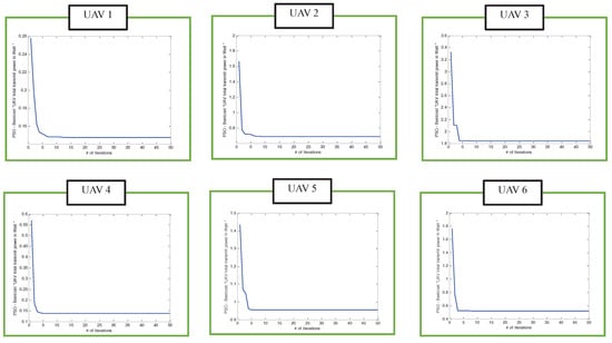 Meanwhile, the convergence speed of the proposed algorithm that iteratively invoked PSO-based clustering algorithm and PSO-based efficient UAV 3D placement for the six UAVs is shown in Figure 8. It can be observed from this figure that the proposed algorithms converge to the total UAV transmit power smaller than the threshold value of 1 watt within a few iterations.