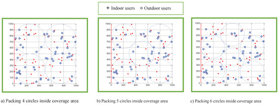 Meanwhile, in [24], the authors studied the efficient placement of multi-UAVs in such that the user coverage probability was maximized and inter-cell interference (ICI) was avoided. More specifically, the authors proposed a non-overlapped circle placement method to find the optimal UAV placement in such that the circle covered the maximum number of users by considering the required total transmit power. In this work, the outdoor users were randomly distributed using spatial points processes (SPPs) and were partitioned into K clusters using a K-means algorithm; subsequently, the optimal UAV placement was determined using the proposed algorithm in such that the user coverage probability was maximized while the total transmit power was minimized. The user coverage probability and the power efficiency were further improved using the proposed iterative algorithms.