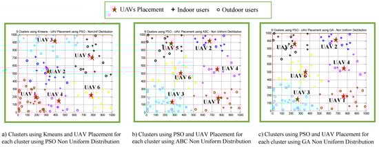 Figure 11 shows three of the clustering results and the UAV placements from Table 5. A similar observation was obtained from comparison of Figure 11a,b, where it can be clearly seen that the K-means algorithm produces clusters that are not symmetric, as discussed in Section 5. It can be seen from Figure 11b,c that the combination of the PSO-based clustering algorithm and the two variants of efficient UAV 3D placement algorithms, namely ABC-based and GA-based algorithms, produced similar performances in terms of clustering results and the UAV placements.