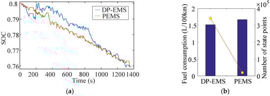 Due to the low speed and lower power demand, the engine mainly works in low engine speed (), and low engine torque (). Meanwhile, the motor mainly operates in low motor torque () and low motor speed (). The fuel consumption under a UDDS cycle is , and the corresponding fuel consumption per 100 km is . Compared with DP strategy, the fuel economy of the vehicle is reduced by 9.5%, while the real-time performance (characterized by the number of state points) is increased by more than 15 times.