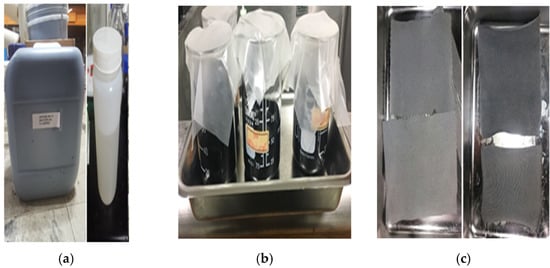 E-textile sensor fabrication process: (a) Carbon-based conductive particle fabrication. (b) Ink mixed with carbon solvents and dispersion stabilizers. (c) Fabrication of electrode and sensing parts.