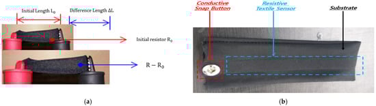 The sensor body comprises CNT coating on latex for flexibility and reliability. After applying a silver-paste for the initial contact point during the manufacturing process, the conductive cloth is attached with conductive thread. The initial resistance value was calculated at less than 100 kΩ for the sensor read-out IC (ROIC). The sensor can detect a length increase of 150% compared to the initial and measures the rate of change in length and thickness. At contact points between substrate and flexible sensors, cracks can occur and produce nonlinear characteristics in the resistance change graph. Contact points were manufactured, as shown in Figure 4.