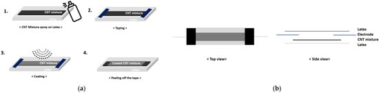 Encapsulation production process: (a) (1) CNT Mixture spray on latex. (2) Taping. (3) Latex spray coating. (4) Tape removal. (b) Erection measurement sensor structure diagram top and side views.