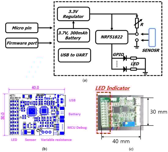 In the design of the connection part, a sensor ROIC circuit was manufactured to convert the variable resistance value of the resistance sensor into a voltage value through the Voltage Divider Circuit, and a low pass filter was designed to suppress signal noise. In the control unit design, NRF51822 (Nordic)- and Coterx-M0 (MCU)-based low-power circuits were configured, and MCU- and BLE-integrated chipsets were used to minimize sensor size. An array of 10 LED indicators was used to detect changes in sensor values, as shown in Figure 5.